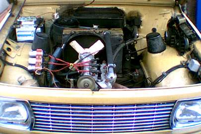 Etwas ungewöhnlich für einen Wartburg 353W: Hier werkelt ein alter BVF H362 Vergaser, der bis Nov. 1963 verbaut wurde. Warum der Vorgänger dieses alte Stück einbaute, wissen wir nicht. Vermutlich handelt es sich um ein Austauschmotor, bei dem das Ding dran war. Jedenfalls bekam er seine ASU und der Motor läuft auch ganz ordentlich. |