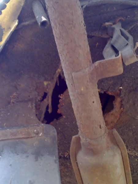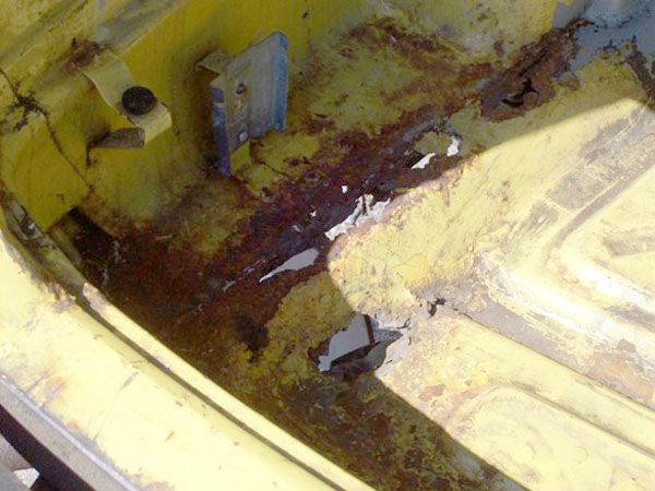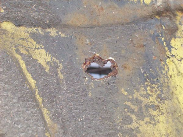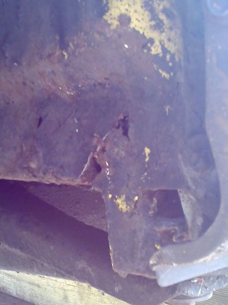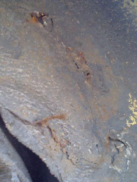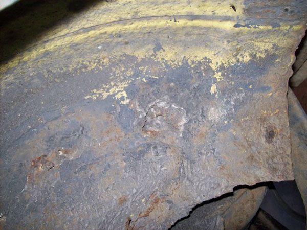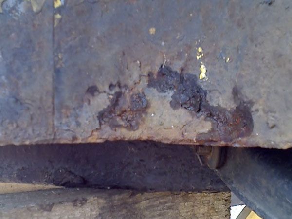 Folgende 3 Bilder: Das Blech ist stellenweise (großflächig) so in Rost übergegangen, daß der Rost beim Anklopfen in großen Mengen herunterfällt. Keine Chance, "mal eben" ein neues Blech anzuschweißen. Die Substanz hat schon das "Blätterteigstadium" verlassen und könnte eher als "Blumenerde" beschrieben werden.