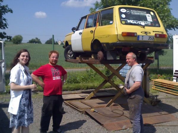 Bild links: Sebastians Wartburg auf der Hebebühne bei Olaf (Sebastian im roten T-Shirt), Frau "Warti-Ben" und Olaf.