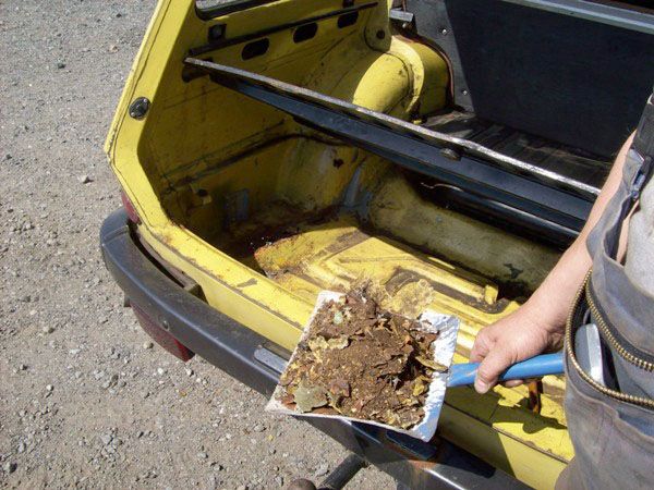 Obwohl Sebastian über zahlreiche Ersatzreparaturbleche verfügt, war allen Anwesenden völlig klar, daß die gesamte Karosserie in einem so stark verrostetem Zustand ist, daß nur eine Totalsanierung hilft und möglich ist. Alle Radkästen, Bodenblech vorn, hinten, Schwellerenden, Reserveradmulde, Seitenwände, C-Säulen sind so heftig durchgefault, daß das Einschweißen von Reparaturblechen mit den dazu erforderlichen Arbeiten (Zerlegen, Reinigen, Nachbehandeln,...) nur mit einigen Wochen/ Monaten konsequenter Arbeit zu erledigen wäre.