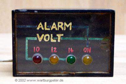 Dieses schon etwas verblichene Kästchen zeigt bei eingeschalteter Zündung mit den linken 3 LED's die Spannung an. In Stellung Parken des Zündschlosses, wechselt die Anzeige zur rechten LED, die stromsparend blinkt. Nicht nur, daß das Blinken für eine scharfe Alarmanlage gelten kann, abhängig von der Blinkfrequenz kann man die Spannung der Batterie abschätzen: je niedriger die Spannung, um so länger leuchtet die LED mit kurzen Dunkelphasen, bis zum Dauerlicht. Je höher die Spannung, um so mehr blitzt die LED mit längeren Dunkelphasen. Ab 14V bleibt sie dunkel. |