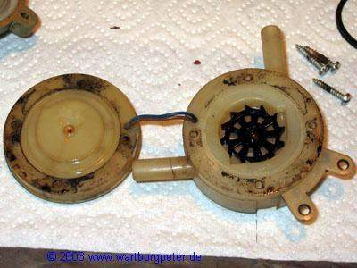 Da die Dichtheit des Gehäuses nicht mehr gegeben war, also alles zerlegen, reinigen. Das Gehäuse ist aus Plastik und hat sich leicht verformt. Insbesondere an den Stellen der Schrauben ist das Material sogar eingerissen. Anschließend alles wieder zusammenbauen und zusätzlich mit Dichtpaste abdichten. |