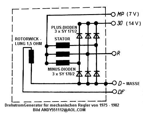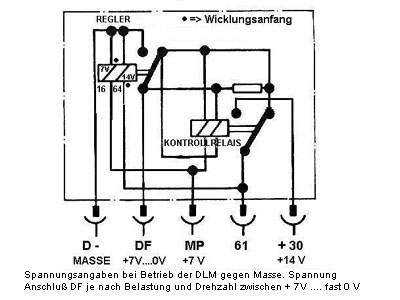 Wird die Zündung eingeschaltet, fließt ein Strom von der Batterie über die Ladekontrolleuchte, die Ruhekontakte des Kontrollrelais, die Ruhekontakte des Spannungsreglers (Unterlage), den Anschluß DF des Generators, die Kohlebürsten sowie die Schleifringe zur Erregerwicklung im Rotor und dann zur Masse D-. Dadurch wird die Wicklung im Rotor vorerregt. Der Stromfluß ist durch die Ladekontrolle (12 V 2 W = 0,16 A) und den Widerstand der Rotorwicklung von 1,5 Ω gering. Trotzdem wird beim Anlaufen des Motors eine kleine Spannung im Stator erzeugt.