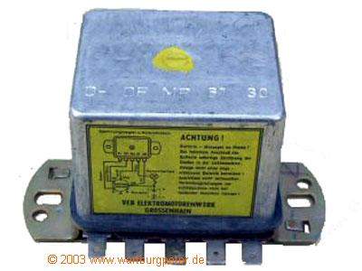 Durch die Art der Reglung entsteht ein positiver Spannungssprung von der Unterlagereglung zur Oberlagereglung von ca. 0,3 Volt. Bei der Einstellung des Reglers ist das zu beachten. Bei 3.000 U/min des Motors, dreht sich der Rotor der Lichtmaschine mit 4.800 U/min. Das wird durch die Übersetzung mittels der Keilriemenscheibe erreicht (Kurbelwelle zu Rotor 1:1,6). Nach Einschalten des Standlichtes zusammen mit der Zündung, fließen ca. 5 A Strom. Danach wird die Spannung am Anschluß 30 des Reglers gemessen. Sie sollte maximal 14,4 Volt sein. Beim Zuschalten der Hauptscheinwerfer kann die Spannung um 0,3 Volt zurückgehen. Werden andere Werte gemessen, ist der Regler auf die mechanische Grundeinstellung zu kontrollieren. Es stimmen dann die Luftspalte und Abstände nicht. Noch eine Eigenart des Reglers ist zu erwähnen. Bei Stillstand des Motors leuchtet die Ladekontrolle mit der Batteriespannung. Wenn nach Lauf des Motors die Zündung ausgeschaltet wird, leuchtet die Ladekontrolle, solange die Lichtmaschine sich dreht, mit der MP-Spannung, also mit 7 Volt. Von MP fließt der Strom über die Ruhekontakte des Kontrollrelais, Ladekontrolle, Verbraucher am Anschluß 15/54 des Zündschlosses gegen Masse.