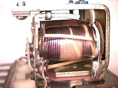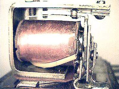 Mechanischer Regler mit abgenommener Kappe: Wicklung links ist das sog. Spannungsrelais und rechts das sog. Kontrollrelais montiert. |