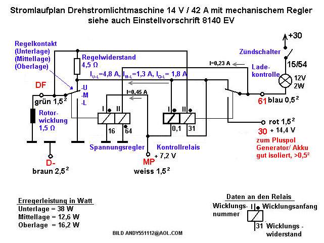 Im Leerlauf des Motors wird eine kleine Spannung im Stator erzeugt. Ebenso bildet sich eine Mittelpunktspannung am Anschluß MP. Die Mittelpunktspannung hat die Hälfte der Generatorspannung. Der Mittelpunktstrom fließt über den Anschluß MP durch die Stromspule des Kontrollrelais Wicklung 1 von 0,1 Ω. Dabei schaltet er die Kontakte des Kontrollrelais um. Die Ladeleuchte verlischt, da sie jetzt beidseitig an 1hren Kontakten die momentane Batteriespannung erhält. Der Arbeitskontakt legt vom Spannungsregler die Wicklung 2 mit 64 Ω an die Batteriespannung. Gleichzeitig fließt der Mittelpunktstrom über den Kontakt des Spannungsreglerrelais (Unterlage) zur Erregerwicklung. Die Erregung nimmt zu, das heißt, die Spannung am Generator steigt. Das Magnetfeld nimmt zu. Durch die Verstärkung des magnetischen Feldes erhöht sich die 1nduzierte Spannung im Stator. Der Generator beginnt einen Strom an Batterie und Verbraucher zu liefern. Für die Erregung und das Spannungsrelais bestehen 2 Stromkreise. Vom Anschluß MP über Wicklung 1 von 16 Ω und vom Anschluß 30 über Wicklung 2 von 64 Ω nach Masse. Warum das Spannungsrelais 2 Wicklungen hat, dazu später mehr.