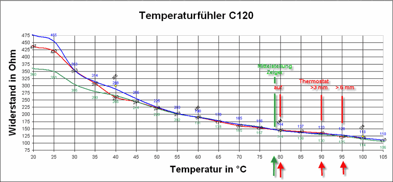 Klar zu erkennen ist der tendenzielle Verlauf der Kurve aller Geber, die also völlig intakt sind und auch den Vorgaben entsprechen. Je höher die Temperatur um so genauer das Widerstandsverhalten. Die Werkssollvorgaben (gelbe Punkte auf der Kurve) stimmen mit dem Ist der 3 Geber überein: