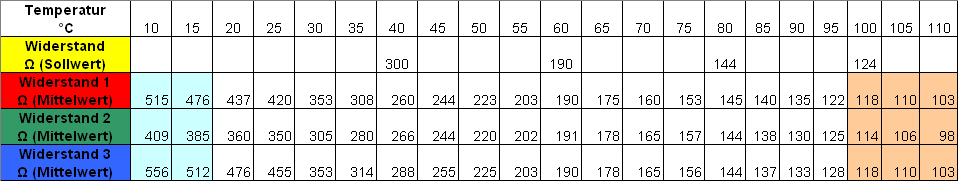 Gemessen habe ich folgende Werte bei ansteigender Temperatur, also von niedrig nach hoch, so wie es im Auto uns am ehesten interessiert. Aufgrund der Trägheit bei der Wärmeübertragung ergeben sich in umgekehrter Richtung (von heiß nach kalt) leicht differierende Ergebnisse. Jedoch genügt die tolerante Einschätzung der Meßdaten für den Einsatzzweck im Auto vollauf. Genauer messen ist mit mehreren Versuchen und Optimierung des Aufbaues sicher möglich, aber daß mache ich erst, wenn ich meine Wartis mit auf den Mond nehmen kann.