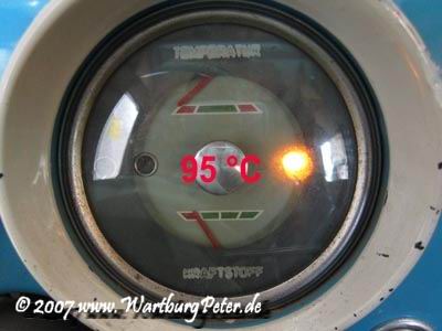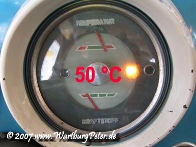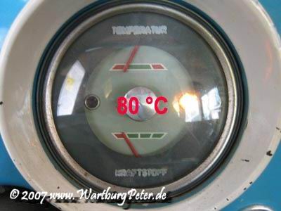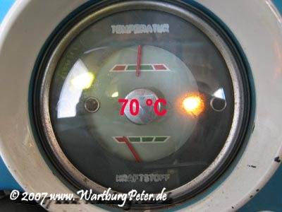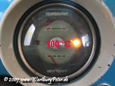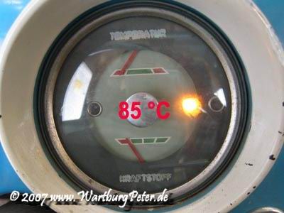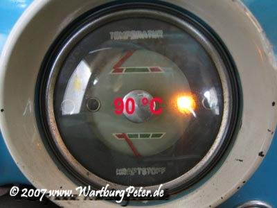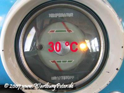 Entsprechend den Werksvorgaben soll das Temperaturinstrument im Wartburg bei Anschluß eines Widerstandes von 150 Ohm (an Stelle des Temperaturgebers) ungefähr in der Mitte stehen. Probieren Sie das einmal aus! Sie haben möglicherweise einen Aha- Effekt, so wie ich. Mein Instrument steht hier bereits am Ende der grünen Skala, obwohl das Kühlwasser gerade zwischen 75 und 80°C aufweist! Also eher "unterkühlt", derweil die Anzeige Panik auslöst...