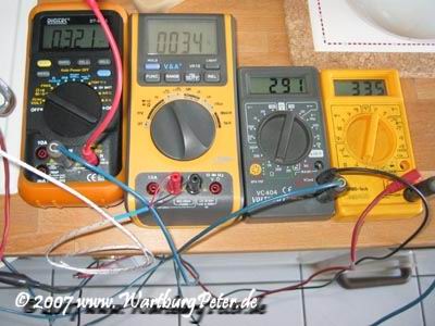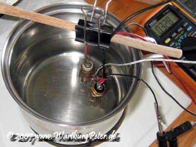 Geber und Temperaturfühler in einen Kochtopf mit Wasser hängen, die Meßinstrumente anschließen. Im Gegensatz zur Messung/ Beurteilung der Thermostaten, hat man zur Erfassung der Meßdaten nur wenig Zeit, daher bekommt jeder Geber sein eigenes Instrument