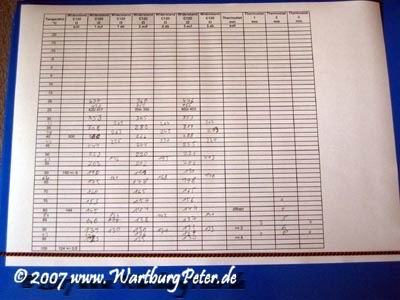 Man kann sich schon einmal eine Tabelle für das Meßprotokoll vorbereiten, dann geht das Eintragen der Werte schneller. Es genügt, wenn man die Widerstandswerte alle 5 Grad abließt. Eine übertriebene Genauigkeit ist nicht zwingend von Nöten, da es im Wartburg ohnehin keine geeichte Temperaturscala gibt. Vorteil ob nacheinander oder gleichzeitig, mehrere Geber auszumessen: man kann die Werte prima miteinander vergleichen und feststellen, ob man richtig gemessen hat oder ein extremer Ausreißer in den Werten vorliegt.