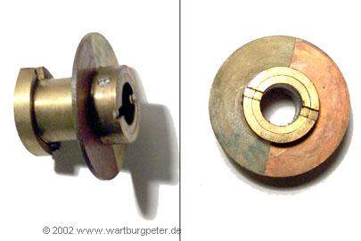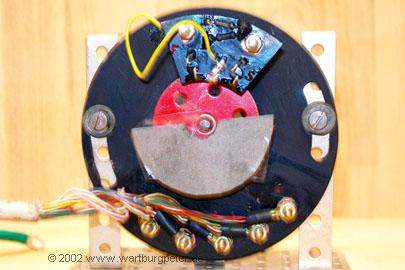 Später ersetzte ich die Lichtschranken durch einen Geber, der auf Basis des A301 (Oszillator) funktioniert. Hinzu kamen wieder der mechanische Fliehkraftregler und damit arbeitete meine Zündung perfekt! (Der Geber stammte aus einer alten Wochentagsschaltuhr) Entsprechend der Originalnockenwelle, fertigte ich mir aus Messing und einer geätzten Platine, eine zerlegbare Sektorscheibe. |