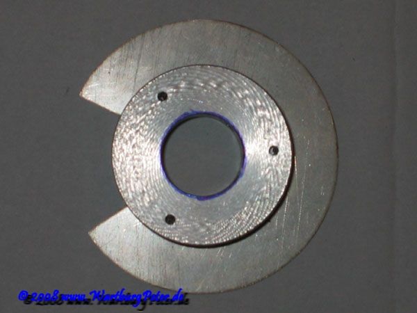 Der Rotor steckt auf dem abgedrehtem Nocken und wird mit 2 Madenschrauben fixiert. Die Sektorscheibe muß einen Ausschnitt von exakt 60° haben, ansonsten funktioniert die Anlage nicht. Bei der originalen EBZA-2s hat der Ausschnitt 140°