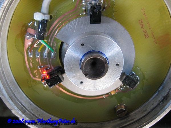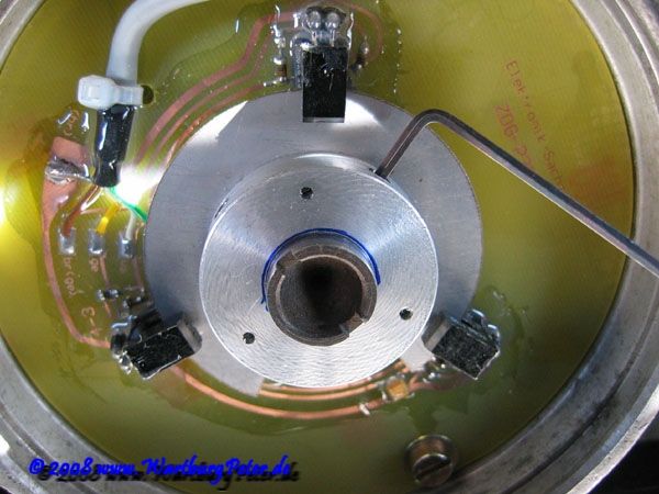 Demontage und Montage der Geberplatine kann nur mit eingefädelter aber gelockerter Sektorscheibe erfolgen.
