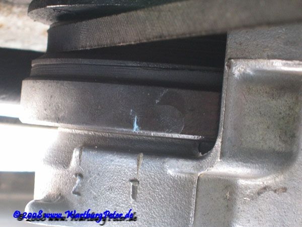 Noch einmal ein Blick auf die Markierungen auf der Keilriemenscheibe und dem Zündgehäuse. Hier steht der Kolben 1 etwa in Höhe OT.