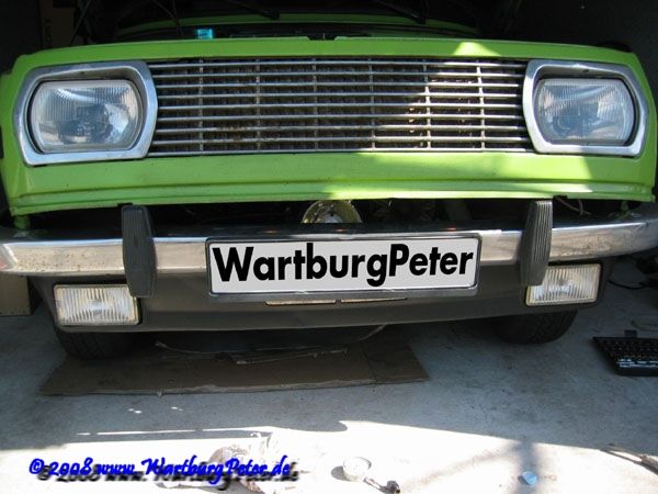 Wartburg mit angelüftetem Frontmittelteil. Wenig Platz, um die Zündanlage einzustellen und dabei sicher zu gehen, daß die Sektorscheibe nicht nur den richtigen Zündzeitpunkt bekommt, sondern die richtige Höhe, ohne an der Lichtschranke zu schleifen. Mehrfache Kontrolle, auch mit einem kleinen Spiegel hilft.