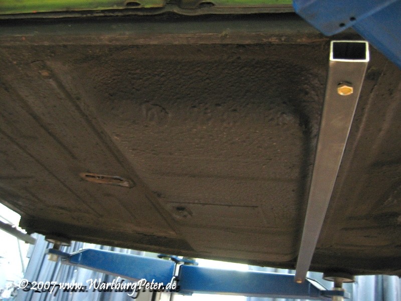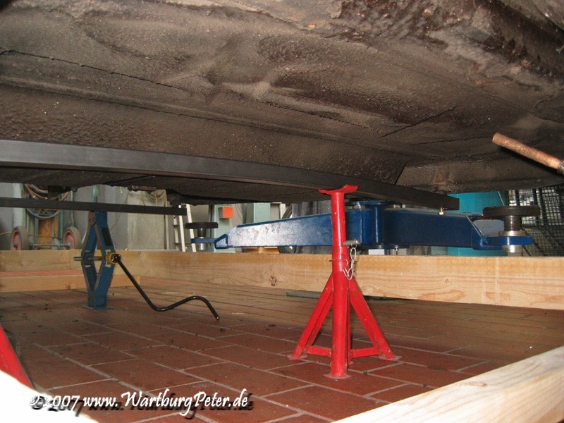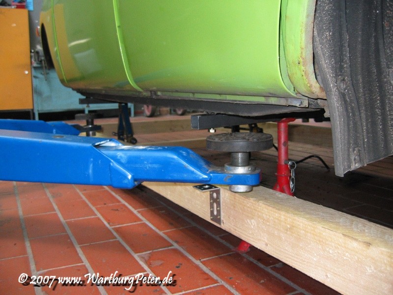 Alles gelöst? Dann müssen die Auflageteller der Hebebühne so unter dem Schweller plaziert werden, daß allein die Karosserie angehoben werden kann.