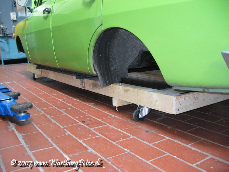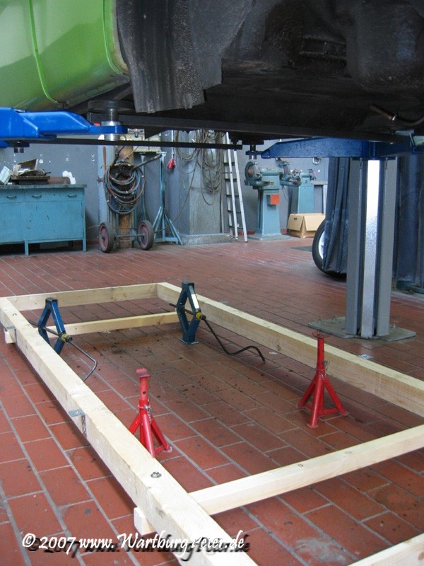 Das Fahrgestell kann nun herausgerollt werden. An seiner Stelle wird nun der Hilfsrahmen befestigt. Dafür habe ich mir eiserne Vierkantprofile angefertigt, die genau von Schweller zu Schweller an die entsprechenden Karosserieauflagegewinde passen. Die Karosserie senke ich mit den befestigten Profilen auf das Holzgestell ab und befestige diese dort.