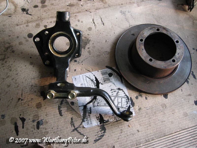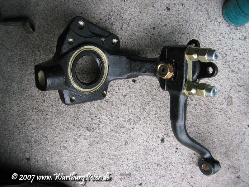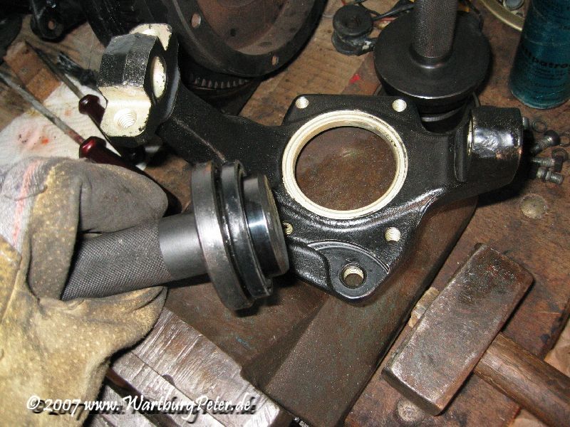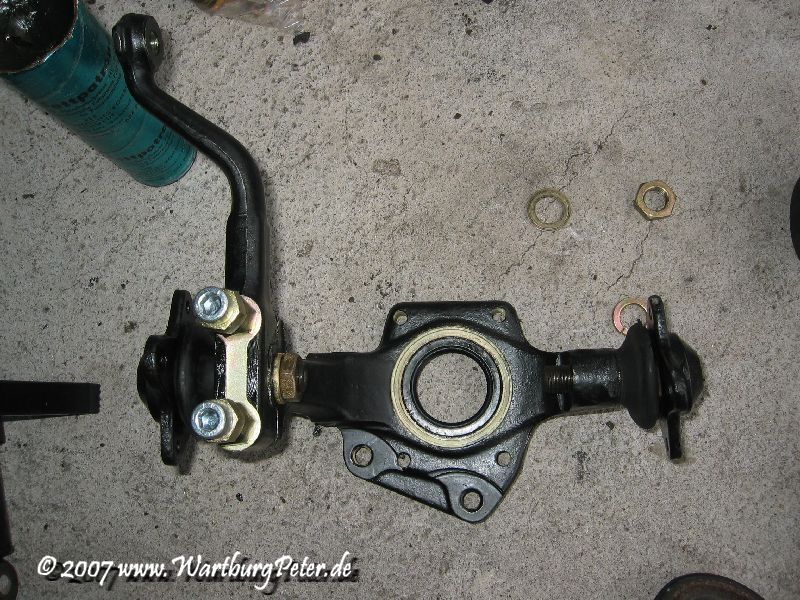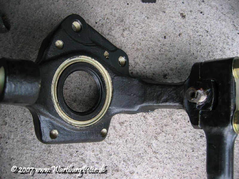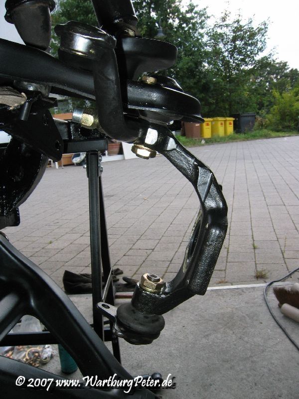 Um die Spurstangenhebel zu befestigen, zieht man sie am besten mit längeren Schrauben in die Position, statt einen Hammer oder den Schraubstock zu bemühen. Nur so ist gewährleistet, daß die Schrauben passen.