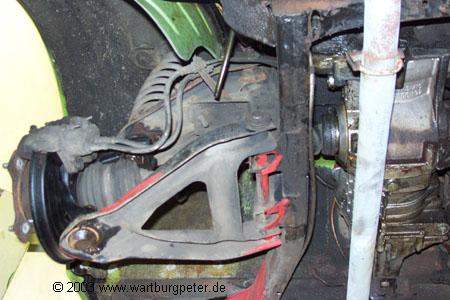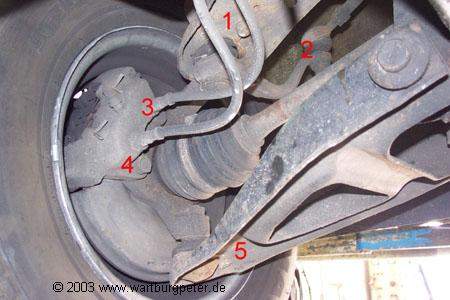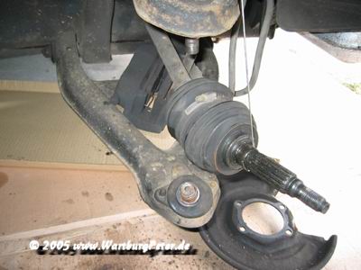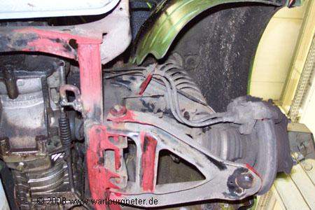 Die Demontage ist manchmal nicht ganz einfach, weil Muttern zu weilen sehr fest sitzen können, sogar die Mutter für die Antriebswelle außen. Sie können dies vermeiden, wenn Sie sich zur Angewohnheit machen, alle Schraubverbindungen vor dem anziehen zu säubern und einzufetten. Ebenfalls leicht eingefettet werden die Koni der Kugelköpfe |