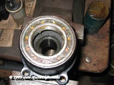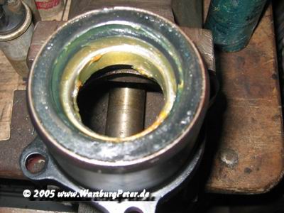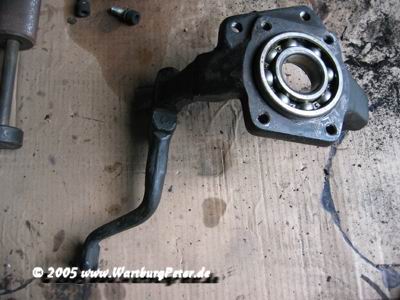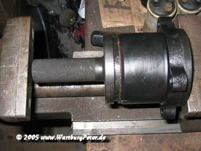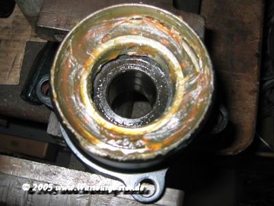 Schon halb eingepreßtes Radlager 6009. Mit dem Distanzring des Werkzeuges, wird es auf die richtige Einbautiefe gebracht. Wer das Werkzeug nicht besitzt, muß darauf achten, daß das Lager nicht verkantet und in die richtige Tiefe gepreßt wird. Mit einem Stück passenden Rohres geht das auch, jedoch nur auf den Außenring drücken! |
