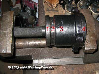 Werkzeug (2) und (3) dienen der Demontage und Montage des Radlagers 6009 und des äußeren Dichtringes in der Radnabe, ebenfalls in der passenden Tiefe.