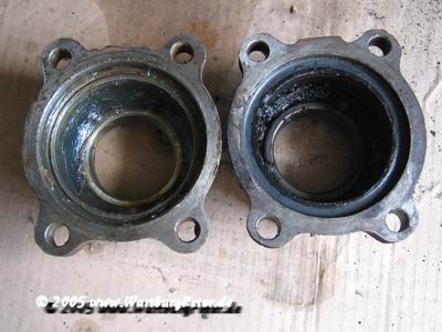 Ebenso kann der Lagersitz in der Radnabe (unten links im Bild) ausgelutscht sein. Auch diesen sollte man ggf. ersetzen können. Das äußere Radlager muß straff in der Nabe sitzen und darf nicht lose "reinfallen".