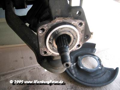 Gesetzt den Fall, Sie verfügen nicht über ein so schickes Werkzeug, wie ich, müssen Sie den gesamten Antrieb ausbauen. Für gewöhnlich geht die Demontage bis zu dem Moment, an dem man Radnabe und Bremsscheibe vor sich auf dem Boden zu liegen hat, leicht. Sollte die Antriebswelle nicht freiwillig herausrutschen, auf keinen Fall zum Hammer greifen! In dieser Situation gibt es zwei Möglichkeiten: