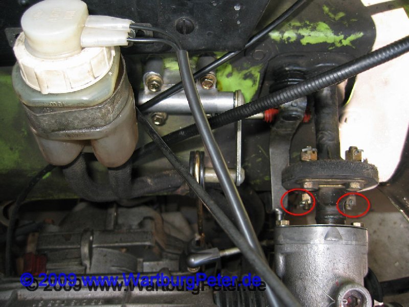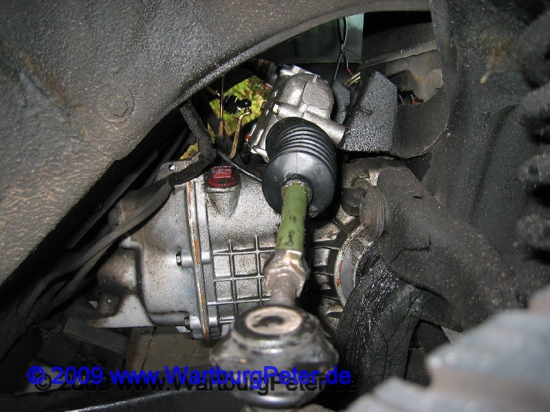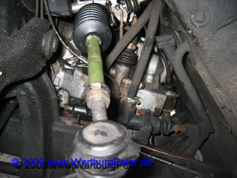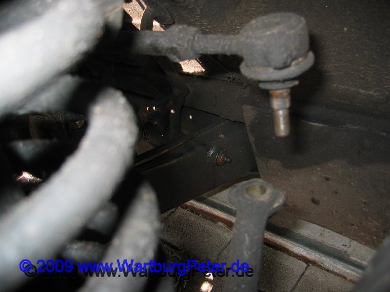 Zum Glück kommt man an alle zum Ausbau des Lenkgetriebes erforderlichen Schraubverbindungen sehr gut ran. Der Wartburg kann auf den Rädern (in Geradeausstellung) stehen bleiben. Meine Spurstangenköpfe sind mit selbstsichernden Muttern gesichert, die findet man auch ohne hinzusehen. Mit dem Spurstangenkopfabdrücker sind die Kugelköpfe rechts und linksschnell aus ihrem Sitz befreit.