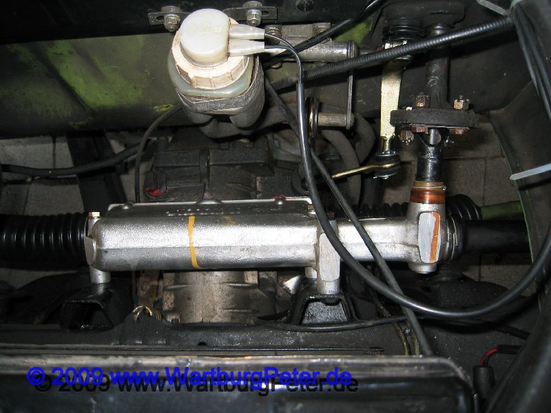 Nach Lösen der 3 Halteschrauben am Lenkgetriebe läßt sich das Lenkgetriebe nach unten oder oben ausfädeln. Platz ist zum Glück genug vorhanden.
