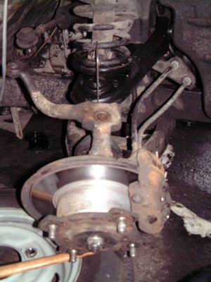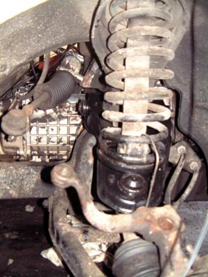 Es ist empfehlenswert, den Ein- und Ausbau zu zweit vorzunehmen. Standardwerkzeug, sowie ein Abdrücker für Spurstangenkopf und Kugelkopf genügen. Bevor das Fahrzeug aufgebockt und die Reifen demontiert werden, sollte man auch die Zentralmutter der Antriebe lösen. Die Antriebswellen sollten gleich mit gewartet werden. Merke: Mit einem Drahthaken die Vorderachse fixieren, die Bremsschläuche dürfen nicht belastet werden (siehe Bild). |