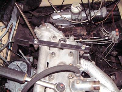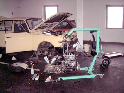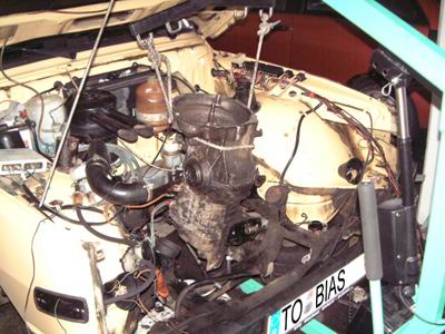 Laut Handbuch kann eine spezielle Halterung in die Kerzenbohrungen geschraubt werden, an der der Motor hoch gehoben werden kann. Tobias hat sich dabei leider ein Kerzengewinde demoliert und muß nun noch den Zylinderkopf wechseln. Das Mittelstück der Stoßstange sollten entfernt werden und eine Decke über Rahmen und Schürze gelegt, schützt vor Schrammen! |