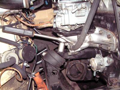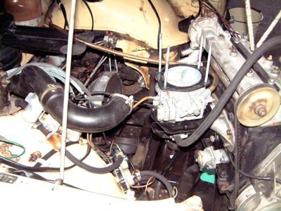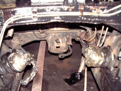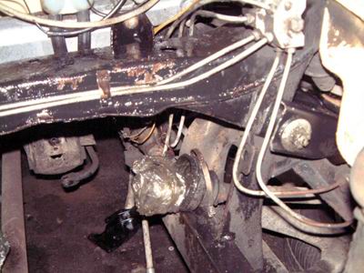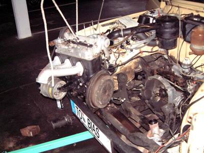 2. Es ist einfacher, Motor und Getriebe außerhalb des Autos zu vereinigen, und zusammen rein zu heben. Der verwendete Kran sollte aber dann der Last auch gewachsen sein. Meiner war’s nicht. Getriebe allein reinheben geht schwierig, weil der Schwerpunkt des Getriebes zwischen dem Differential und dem Hebelchen des Freilaufs liegt, und damit genau unter dem Rahmenquerträger. Man müßte also von hinten unten was drunterbauen. Aber Motor und Getriebe zusammen haben den Schwerpunkt auf Höhe der Kupplungsglocke (vielleicht etwas davor) und lassen sich recht gut einfädeln. Dabei sollte man beachten, daß man nicht an die Schläuche vom Bremsflüssigkeitsbehälter zum Hauptbremszylinder kommt. Vor allen Dingen, wenn diese so brüchig sind, wie meine waren. Egal, jetzt sind da erst mal gar keine Schläuche mehr. D. h. die Montage der neuen Schläuche (und das Entlüften der Bremse) sind erst mal hintenangestellt. Noch gibt’s wichtigeres (s. u.). Und das mir, der ich propagiere, alle alten Gummis konsequent zu wechseln. Peinlich, peinlich.