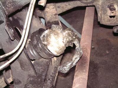 Zuvor sind die Antriebswellen herauszunehmen, dafür wurde zu Beginn die Vorderachse gelöst. Zuerst zieht man den Antrieb radseitig heraus, dann auf der Getriebeseite, indem man zugleich mit einem Tuch in der Hand unter das Dreifingergelenk greift. Man Umschließt das Gelenk, um zu vermeiden, das die Stifte und Hülsen verloren gehen. Ein Stück Bindedraht sichert das Tuch und damit das Gelenk einstweilen. |