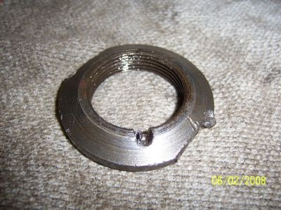 Und hier noch mal eine kleine Nettigkeit des Getriebeinstandsetzers vor mir (leider unbekannt). Die Linksgewindemutter des Drucklagers. Sie war so mit dem Meißel angebrummt, daß da nix mehr war, um den Hakenschlüssel anzusetzen
