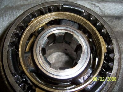 Interessanter wird es bei den Synchronkörpern (links). Da muß man schon genauer hinsehen (mitte). Hier sind an den Anlaufstellen zum Reibkegel des Losrades 3. Gang schon deutliche Abnutzungen erkennbar. Folge: Schaltgeräusche!