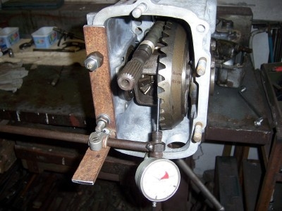 Nachdem das Differential eingebaut war, ging es an das einstellen. Irgendwo vorher hatte ich mal erklärt, was die Zahlen, die im Tellerrad eingraviert sind bedeuten. Bei diesem Differential sollte das Flankenspiel 0,22mm betragen. Aus einem Flacheisen und einer Rohrklemme hab ich mir unter Zuhilfenahme einer Zündeinstelluhr eine Einstellvorrichtung gebaut.