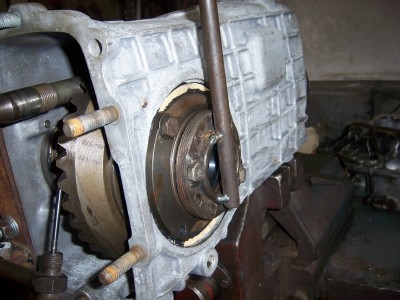 Die Kupplungsglocke wird zum Anbau vorbereitet, die Dichtung sitzt schon.