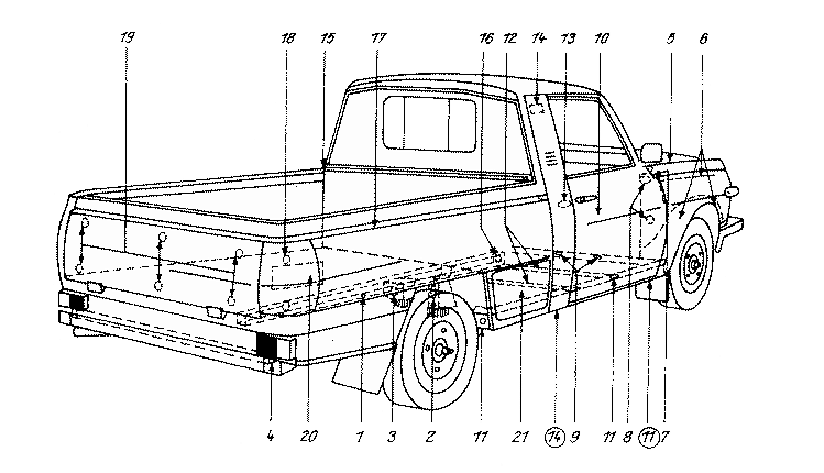 | 16 | B | vordere Längsträgerenden für Ladefläche | in Fahrerhausrückwand hinter den Sitzen | hinten | Sitze vorrücken, Reserverad ausbauen. Stopfen entfernen |