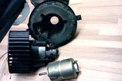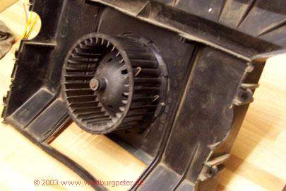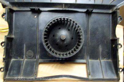 Also war ich auf dem Autofriedhof und habe mich nach verschiedenen Lösungen umgesehen. Am Geeignetsten erschien mir, einen Lüfter vom Golf II / III zu nehmen. Der ist leistungsstark, mit wenigen Handgriffen ausgebaut (Beifahrerseite unterm Armaturenbrett) und läuft deutlich leiser als der vom Wartburg. |