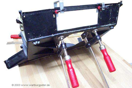 Frag mich blos niemand nach Maßen und Skizzen. Irgendwie habe ich das mit Schraubstock und Laubsäge hinbekommen und es paßte auf anhieb straff in das Gehäuse. Die Pfalze und Winkel stabilisieren das filigrane Gebilde. Nach dem ich alles festgenietet habe, ist das Gehäuse wieder akkurat gerade. |
