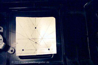 Soll der Lüfter später "senkrecht", also mit dem Anschlußfeld nach oben zeigen, muß beim Anzeichnen der Nasen dies durch Verdrehen der Schablone entsprechend berücksichtigt werden. Ein- und Ausbau also bei ca. 1 Uhr, Arretierung bei 12 Uhr. |