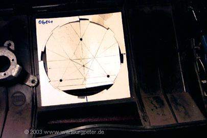 Zunächst heißt es wieder Maß nehmen, vergleichen, Einbaulage ermitteln. Am besten per Schablone! Ich habe mich entschlossen, das Gehäuse so umzubauen, daß man den Golflüfter wie im Golf mit einer kleinen Handbewegung ein- und ausschrauben kann. Dazu muß ich eine Öffnung mit etlichen Haltenasen aus dem Verteilergehäuse herausarbeiten. |