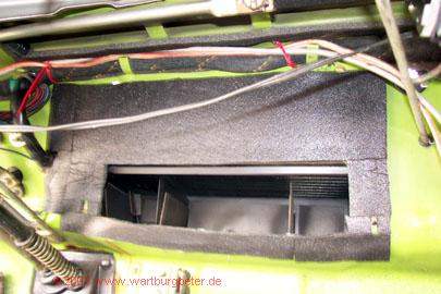 Der Übergang zwischen Verteilergehäuse und Frontscheibenbelüftung (Karosserie) hat bisher genügend Spalt besessen, so daß die Luft auch unter das Armaturenbrett geblasen wurde. also habe ich auch hier einen wichen Schaumstoffstreifen aufgeklebt. |