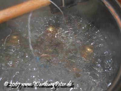 Bei 85°C ist im Wasser nichts zu erkennen, aber man kann den Eintopf ruhig heben, um zu kontrollieren. Die beiden äußeren Thermostaten sind etwa 3mm weit offen, der vom Camping hat schon volle 6mm.