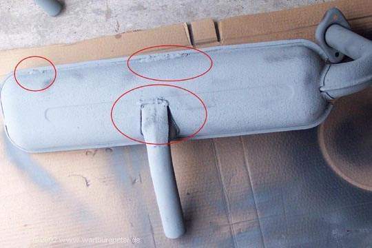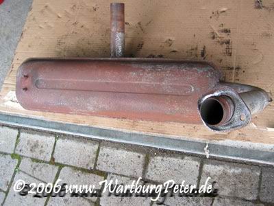 Der Hauptschalldämpfer aus DDR-Produktion zeigt Durchrostungen, die geschweißt werden mußten. Den Schalldämpfer habe ich mit seinem Originallack betrieben! Kein Wunder also, daß er rostet! |