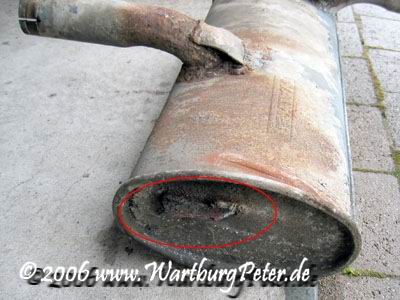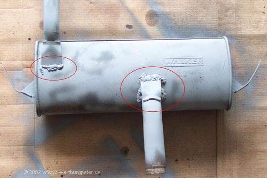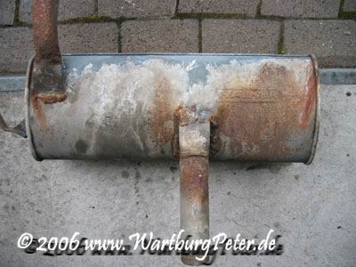 Der Walker Nachschalldämpfer ist zwar nicht verrostet, dafür ist das Blech so dünn, daß er an allen belasteten Stellen eingerissen war. Das Einlaßrohr war völlig heraus.