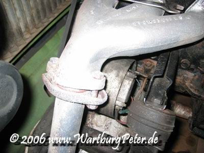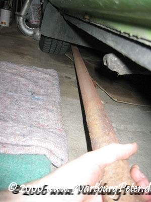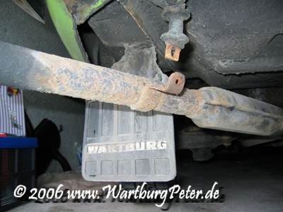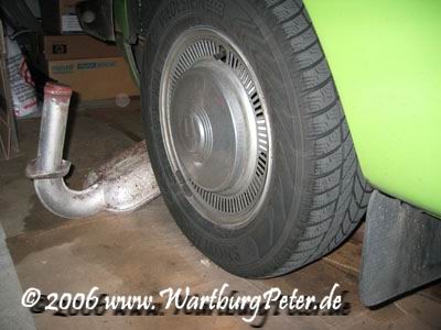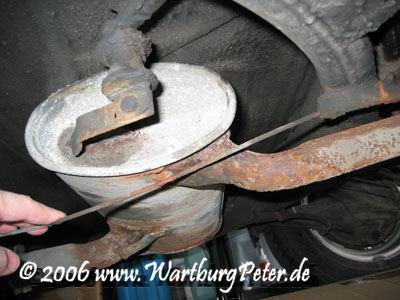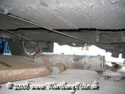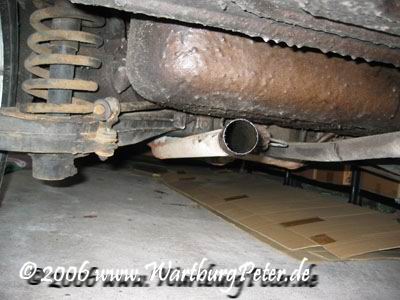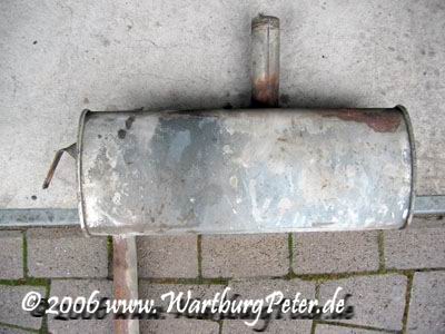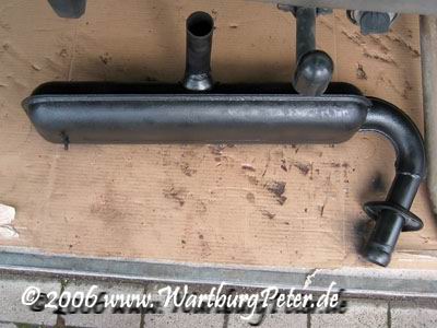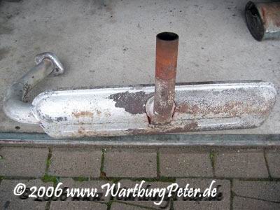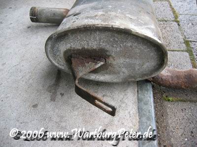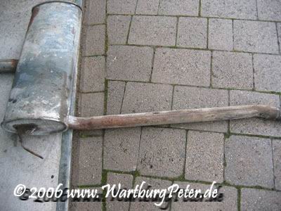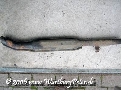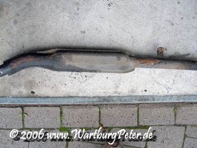 Die Auspuffanlage lies sich mühelos abschrauben und zerlegen. Schraubverbindungen hatte ich immer schön gefettet!! Zum Glück fahre ich Wartburg und ich mußte das Fahrzeug weder aufbocken, noch sonst welchen Zirkus veranstalten. Eine Decke auf den Boden und binnen weniger Minuten lag die Auspuffanlage auf dem Boden und lies sich leicht auseinanderziehen! Der Walker Endschalldämpfer vom Opel, den ich etwa zeitgleich dort eingebaut hatte, den habe ich übrigens bereits letztes Jahr austauschen müssen, weil er ein faustgroßes Loch hatte! |