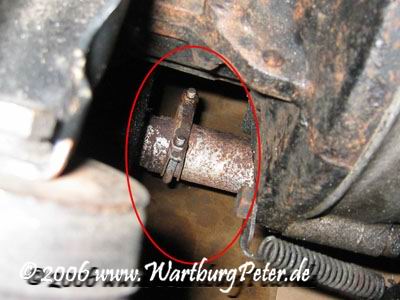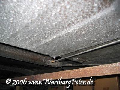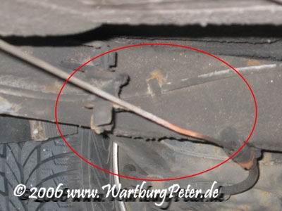 Aufgrund seiner "falschen" Abmessungen, schleift das Handbremsseil bereits im "normalen" Zustand. Ich werde auch das Handbremsseil wechseln müssen, da es inzwischen angerieben und angerostet ist. Sicherheit geht vor. Bei meinem Wartburg Camping habe ich das Problem bereits gelöst, indem ich die Hülsen für die Seilhalterung am Rahmen etwas tiefer setzen ließ. |