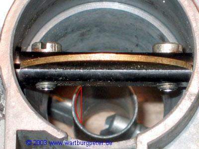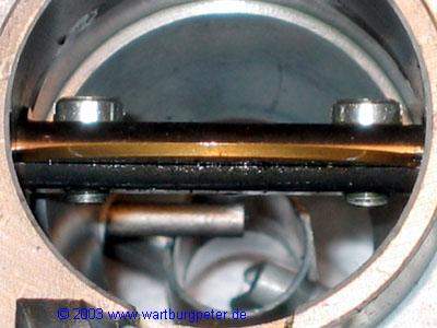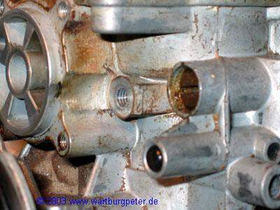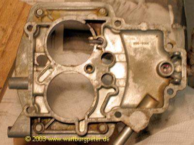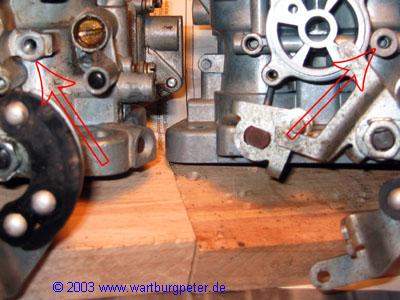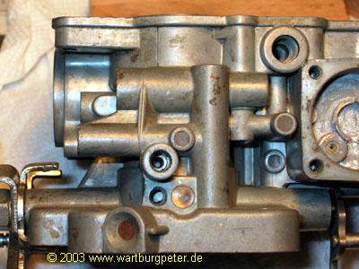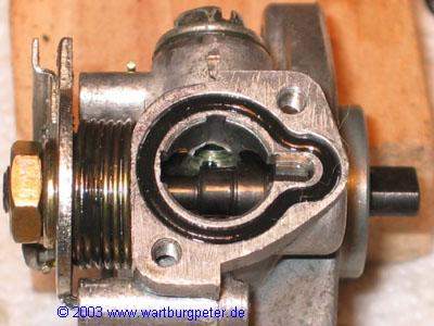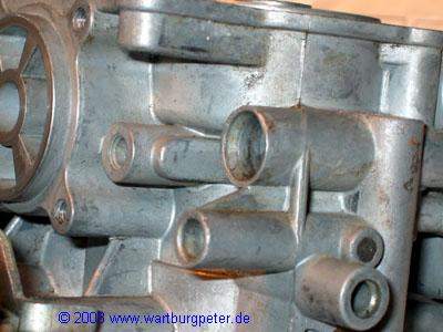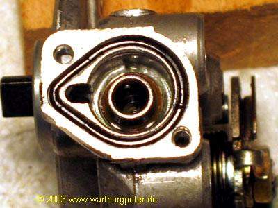 Gegenüber der Seite der Nockenwelle: Man kann ein Stück der Buchse (Druckfeder ist abgenommen) erkennen, welche letztlich die Durchflußmenge reguliert. Nicht zu erkennen ist der Pumpenmechanismus selbst. Dazu müßte ich das Bauteil vollständig zerlegen... Um die Sache vollständig zu machen, für was auch immer, habe ich hier noch links die ältere und rechts die neuere Vergaserdeckelvariante aufgenommen. |